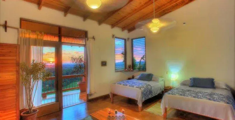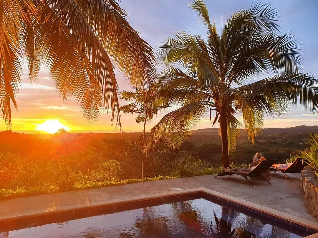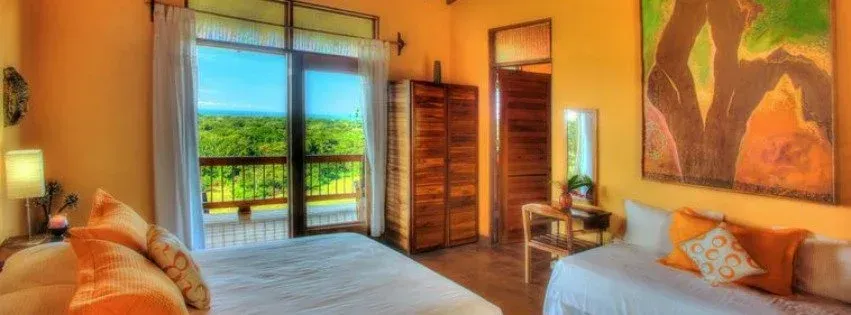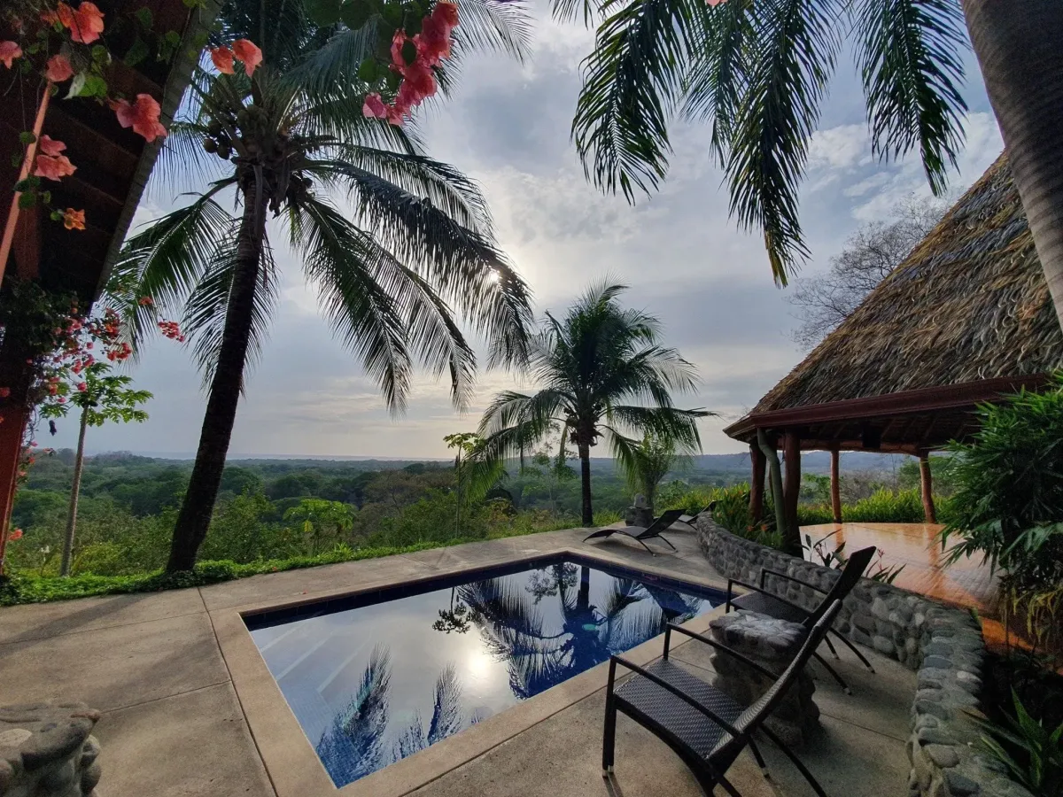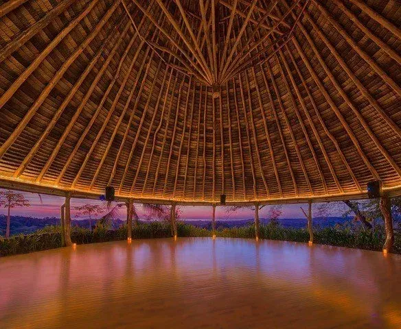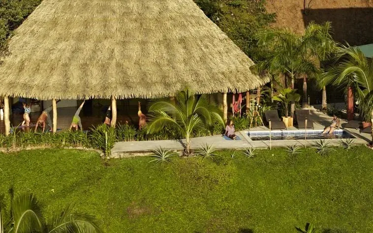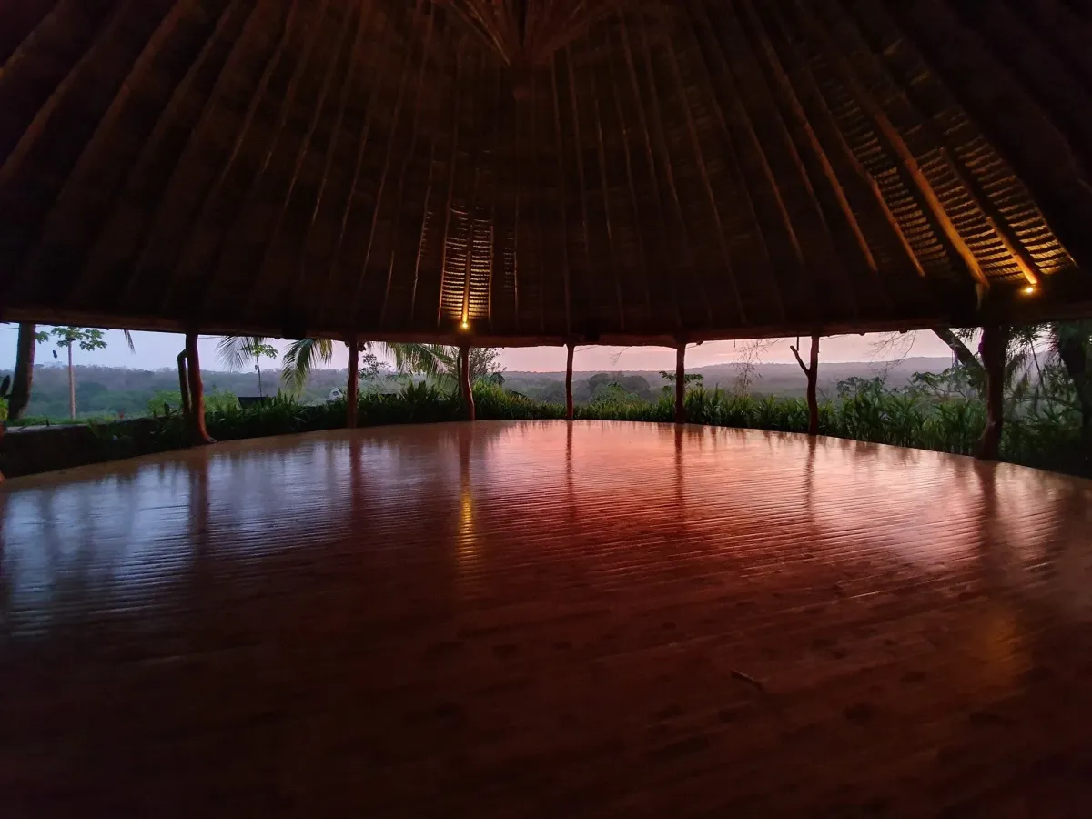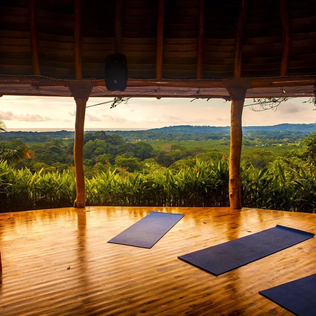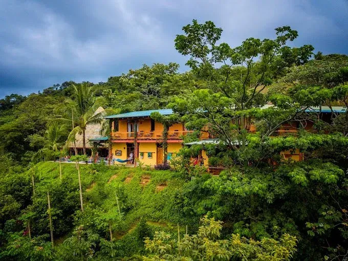 The property is set on lush jungle hilltops and overlooks the sunset over Ostional Beach and the Pacific Ocean. 5 luxury rooms and 4 shared rooms converge with an open dining room and kitchen adorned with hammocks which extend to a dipping pool, hot tub, cold plunge and 700 square foot hand built wooden yoga shala. The grounds also hold a sacred Temescal for sweat lodge ceremonies, permaculture garden and trails to explore a nearby waterfall.